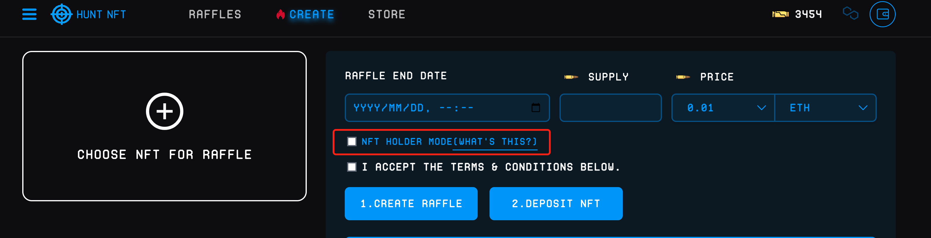 The NFT Holder mode is located within the Create page.In summary, this mode only allows addresses that hold specific NFTs to participate in the raffle. Please note that this mode is intended for B2B (business-to-business) services, and **we kindly request regular users not to choose this option.**